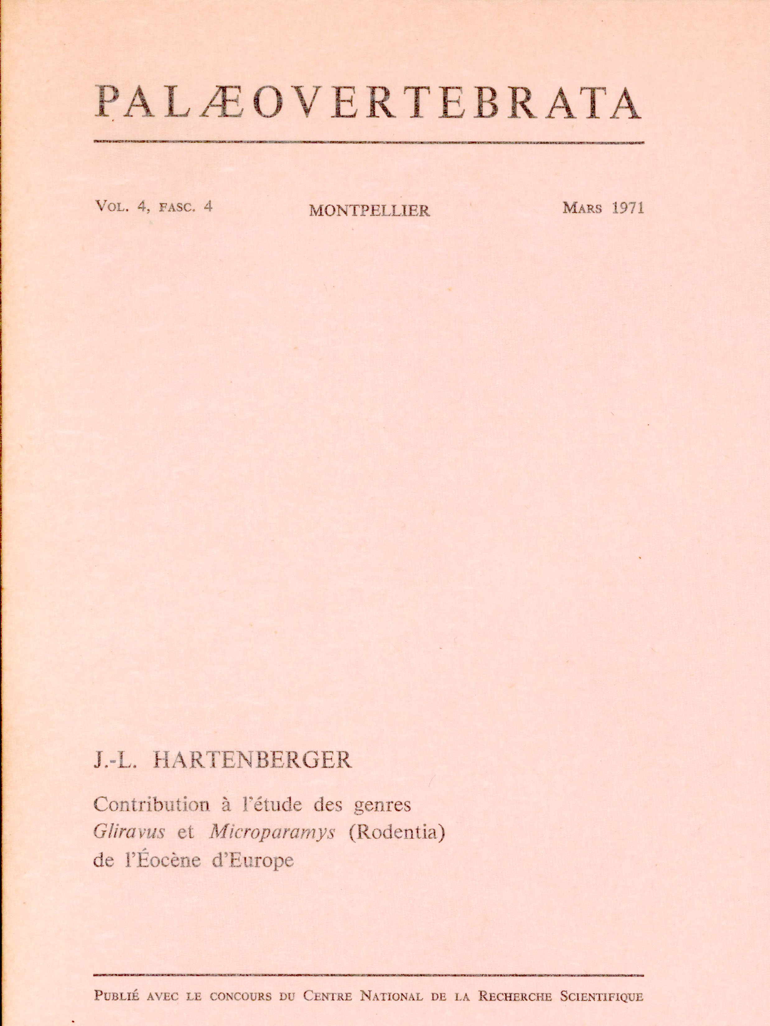 Contribution à l'étude des genres Gliravus et Microparamys (Rodentia) de l'Eocène d'Europe.Jean-Louis HartenbergerKeywords: Eocene; Gliravus; Microparamys; Rodentiadoi: 10.18563/pv.4.4.97-135 Abstract Based on material found in about 15 localities the relationships of the genera Microparamys and Glirarus have been studied. One new genus, two subgenera and three species [Microparamys (Sparnacomys) chandoni n. subgen. and n. sp., Microparamys (Pantrogna) russelli n. subgen., Eoglirarus wildi n. gen. and n. sp., Gliravus meridionalis n. sp.] as well as the publication Article infos |