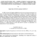 Angolabatis nom. nov.,a replacement name for the Cretaceous genus Angolaia Antunes & Cappetta, 2002 (Chondrichthyes: Rajiformes), a preoccupied name.Miguel T. Antunes and Henri CappettaKeywords: Angola; Campanian/Maastrichtian; homonymy; Hypsobatidae; nomen novum; RajiformesAbstract In 2002, Antunes & Cappetta published several new taxa (genera and species) in a paper on Cretaceous elasmobranch faunas from Angola. One of the new genera was named Angolaia (Rajiformes, Hypsobatidae; type-species: Angolaia benguelaensis Antunes & Cappetta, 2002, Late Campanian/Early Maastrichtian of Angola). Recently, Dr. Christian Kammerer kindly informed us that the genus Angolaia was preoccupied by a cicadellid homoptere (Insecta), published by Linnavuori & Al-Ne'amy, 1983. So, according to mIes of the International Code of Zoological Nomenclature (ICZN 1999, articles 52, 60) this name became unavailable. Consequently, the Rajiformes genus Angolaia is a junior homonym, invalid and must be rejected. In replacement, we propose the new name Angolabatis. Article infos Published in Vol. 34, Fasc. 1-2 (2006) |